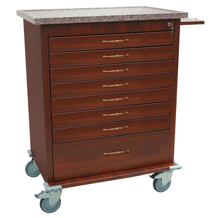 Wood Vinyl Coated Aluminum Unit-Dose Box Medication Cart, Capacity of 294 Boxes. Keylocking Cabinet. Dark Cherry Cabinet Finish and Brown Granite Top Finish. Includes Pull-out Shelf, Drawer Dividers, and Internal Locking Narcotics Box.
