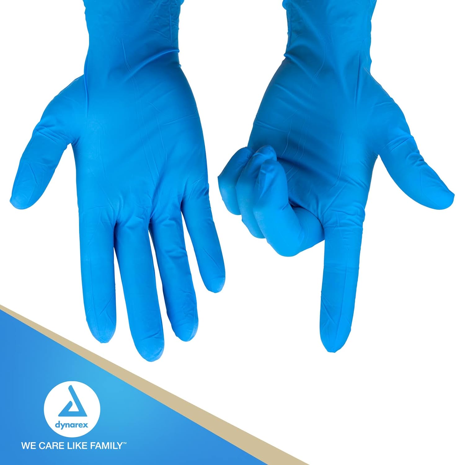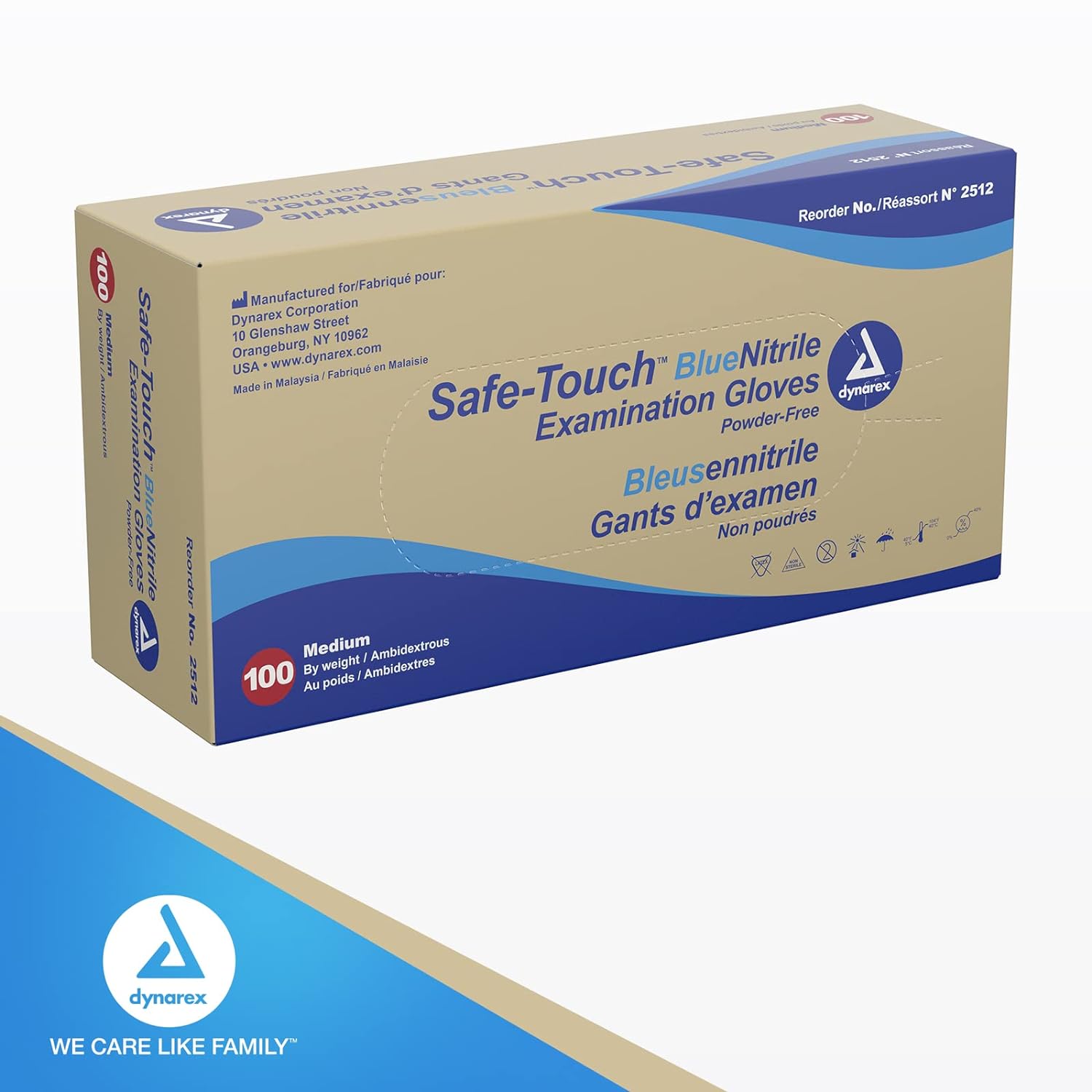 Dynarex Safe-Touch Blue Nitrile Exam Gloves are crafted from specially formulated nitrile rubber for unbeatable puncture resistance and elasticity as compared to other glove materials. The ambidextrous gloves are designed with textured fingertips for increased grip and a minimum 3 mil. thickness for increased tactile sensitivity. A polymer lining and beaded cuff prevent tears and ensure the gloves are easy to don. The gloves fit securely around the wrist and have hand-conforming flexibility to prevent physical fatigue. Frequently used in many settings including medical facilities, EMS and law enforcement markets, long-term care facilities, tattoo shops, hair salons, and more. Available in sizes S, M, L, and XL. Gloves are packaged 100/box and 1000/cs.